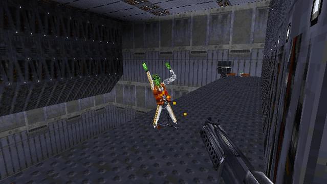 The technical texture of that period matters because Jedi Knight is not a nostalgic relic in the soft-focus sense. It is a full 3D shooter of the sort that still wears the era’s geometry on its sleeve. The presentation has that early 3D PC look, the one that seems endlessly eager to prove the computer is doing something expensive. In 1997 this read as progress, and to be fair, it still has a certain forceful honesty. It is not pretending to be cinematic in the later, more self-conscious sense. It is a machine built to make the player feel like they are moving through a hostile, engineered space with purpose. If that space occasionally resembles a box of screws and industrial mood lighting, well, welcome to the party.